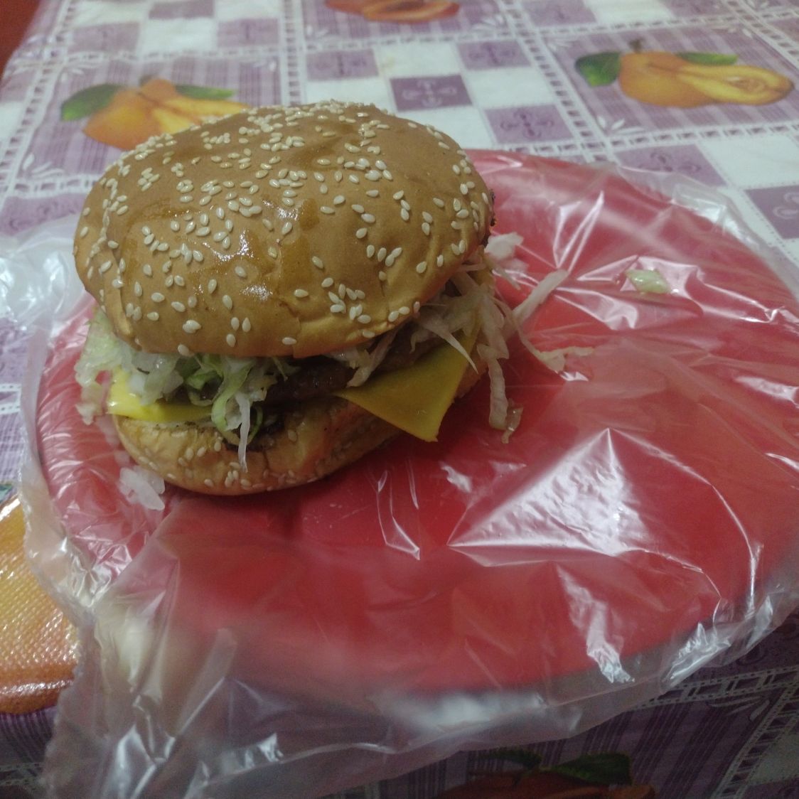 Hamburguesa mediana con doble sabor de carne 3 piezas de queso amarillo con lechuga cebolla jitomate mostaza catsup y aderezo de la casa