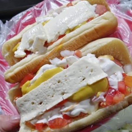 Hot dog salchicha con tocino, jitomate, cebolla, crema, catsup, mostaza,y panela