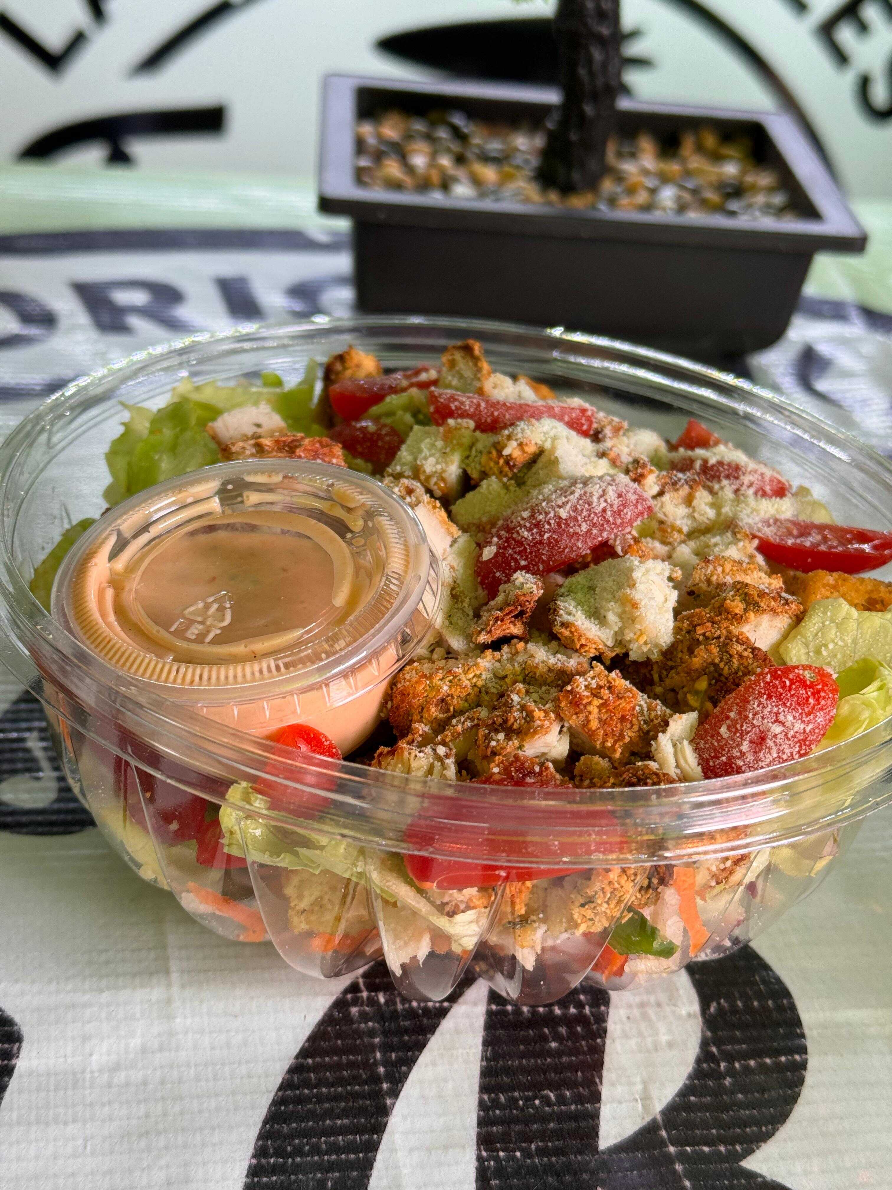 Con pollo empanizado y panela, queso parmesano, crotón italiano, lechuga, zanahoria, vinagreta germinado y aderezo.