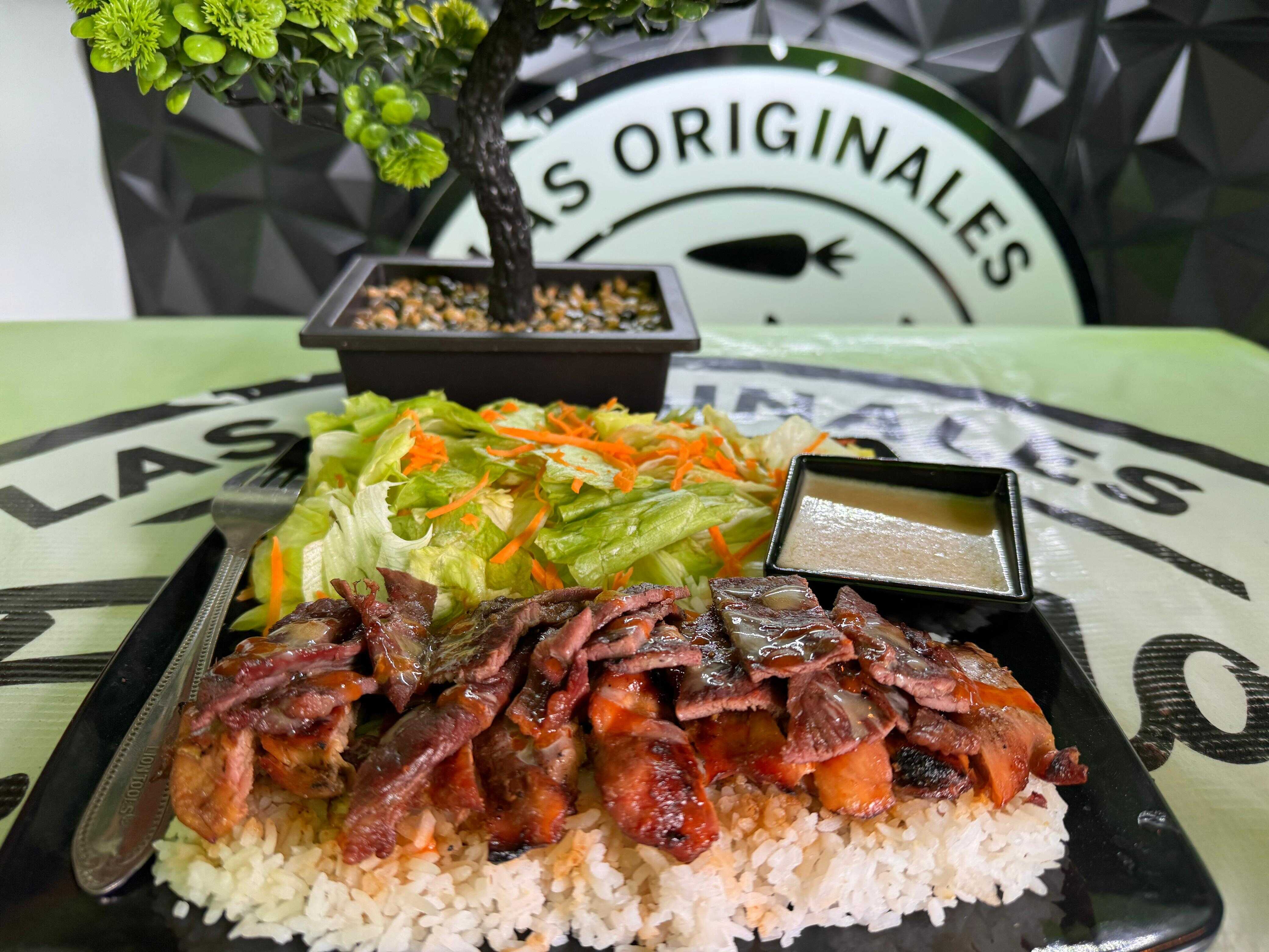 Lechuga zanahoria 150 g de res y 150 g de lomo, arroz, aderezo y sriracha.