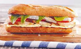 Baguette artesanal (180 g) con proteína a elección (120 g), queso manchego (60 g), mayonesa, aderezo, lechuga (30 g), zanahoria (30 g), jícama, cebolla (20 g), jitomate (30 g) y germinado.