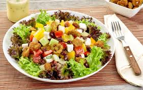 Ensalada elaborada con mezcla de lechugas frescas (120 g), pollo empanizado crujiente (150 g), queso parmesano, crotón italiano, zanahoria (40 g), jícama (40 g), pepino (40 g), morrón, cebolla y germinado, servida con vinagreta y aderezo cremoso.