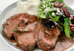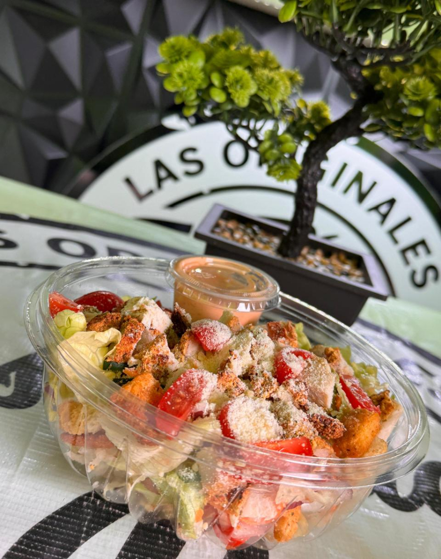 Ensalada fresca preparada con lechuga romana y orejona (120 g), queso panela asado, queso parmesano rallado, crotón italiano crujiente, zanahoria rallada (40 g), jícama en juliana (40 g), pepino (40 g), morrón (25 g), cebolla morada (20 g) y germinado fresco, acompañada de vinagreta de la casa y aderezo cremoso.