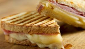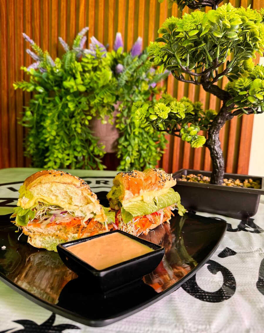 Sándwich elaborado con pan artesanal (120 g), jamón de pierna (60 g), queso panela (100 g), queso manchego (50 g), mayonesa, aderezo, vegetales frescos y germinado.