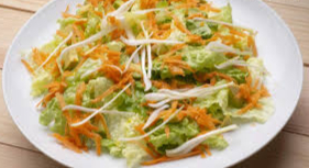 Ensaladas servidas con Lechuga (150 g), zanahoria, 300 gr de peinecillo, arroz, aderezo y sriracha.