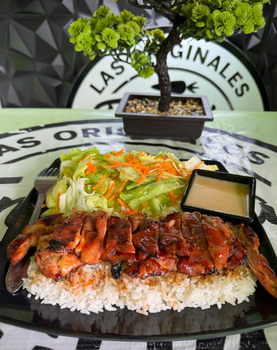 Ensalada con lechuga (120 g), zanahoria (40 g), pollo teriyaki (150 g), arroz al vapor (120 g), aderezo y sriracha.
