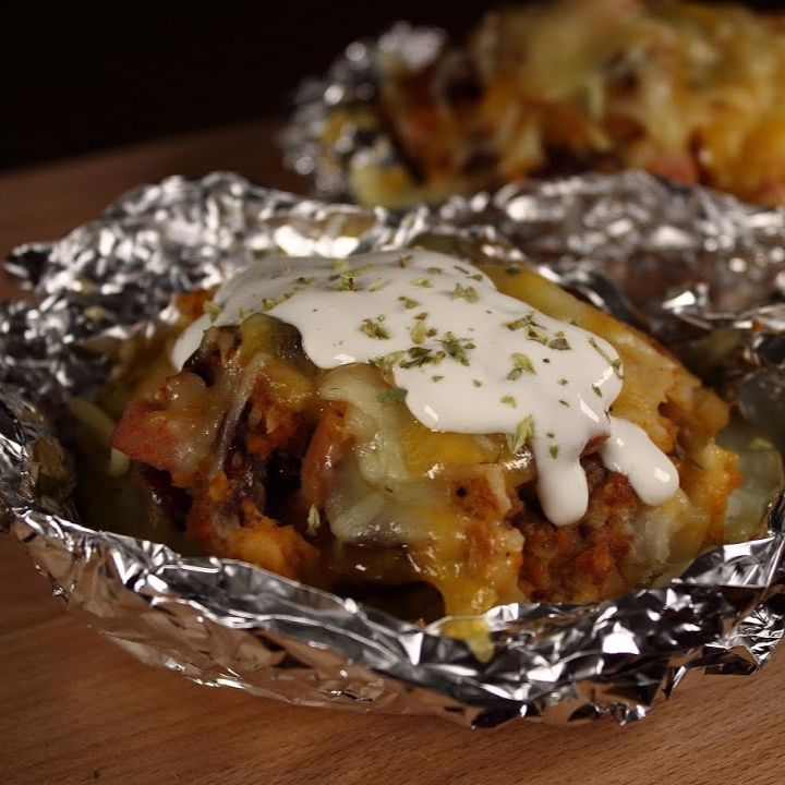 papa cocida en trozos con queso fundido, aderezo chipotle, y carne elegida, salsas aparte.