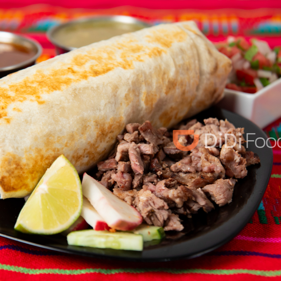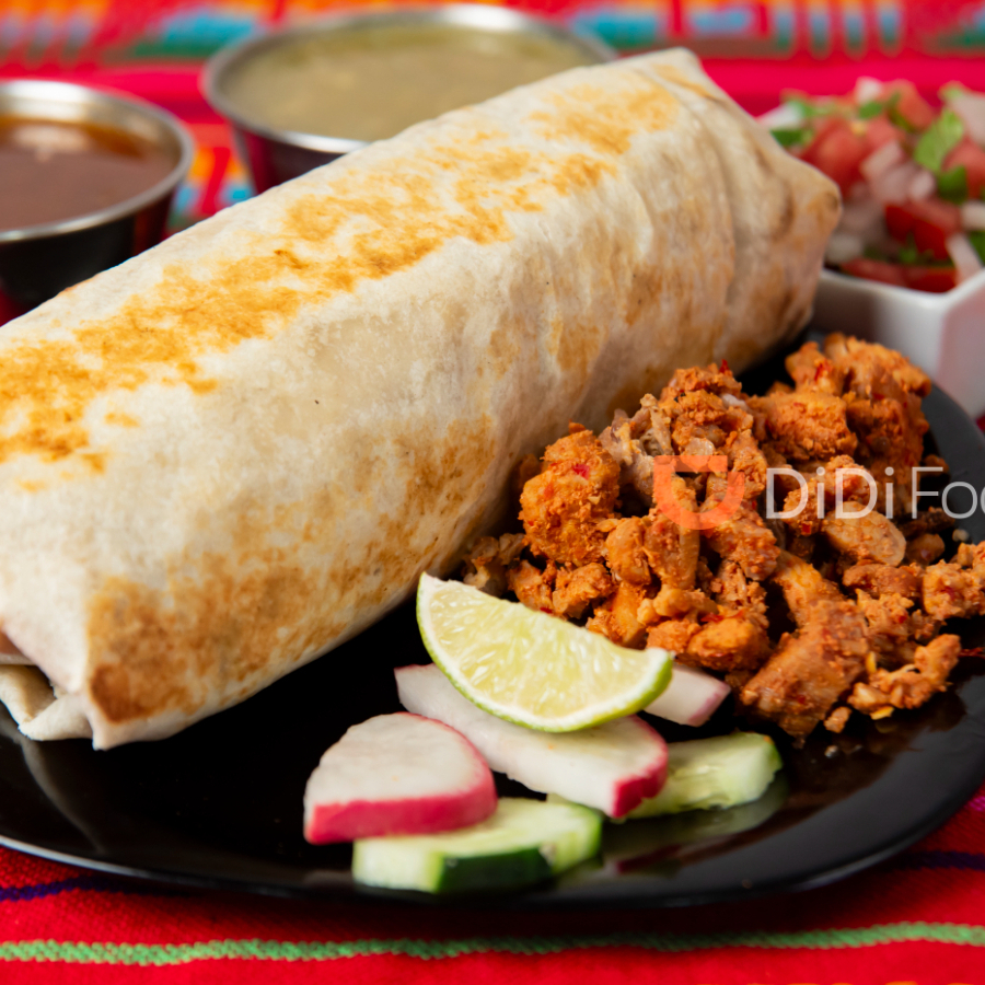 pastor en una tortilla de harina, frijol, arroz, limon y salsa picante aparte