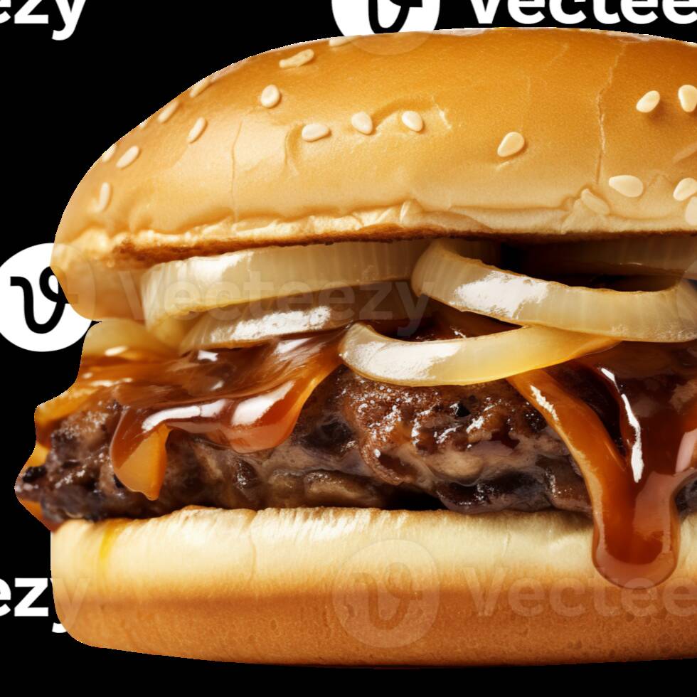 carne burger con cebolla guisada y BBQ, pan con mantequilla, aderezo especial y sobres de catsup.