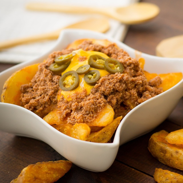 (380 g) trozos de papa, chorizo, chipotle, queso fundido, y salsa aparte