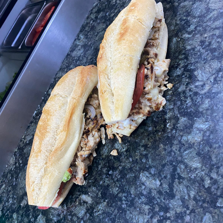 Deliciso lonche de pollo, con base de frijoles fritos, queso asadero, verdura y guacamole.