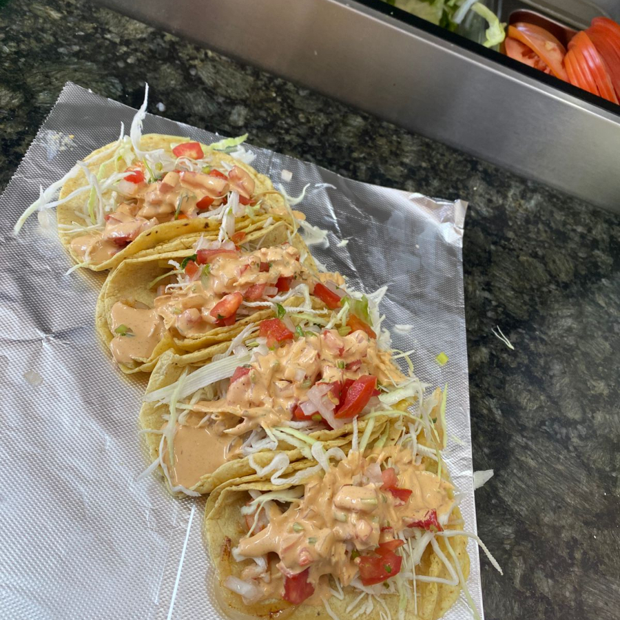 Deliciosos tacos de pescado asado a la plancha, con un aderezo de la casa, pico de gallo y verdura