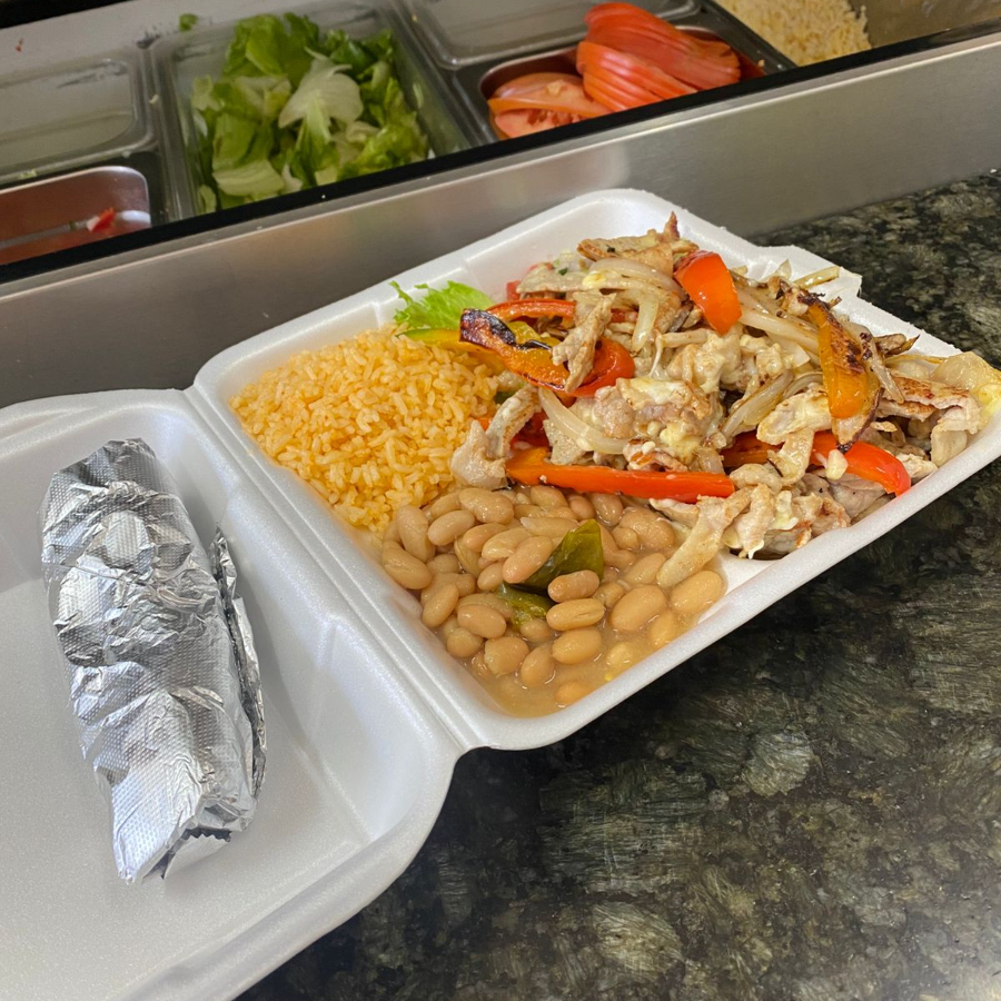 Fajitas de pollo o asada preparado con cebolla morrón y queso (tipo alambre) , acompañada de arroz, frijoles, ensalda y torrillas.