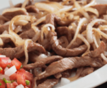 Fajitas de res guisados con cebolla pimiento morrón champiñones y jitomate incluye arroz frijoles y ensalada