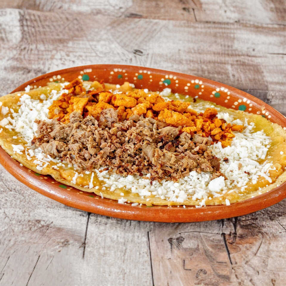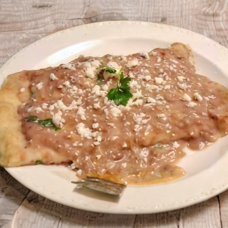 Base de maíz a la plancha con queso bañada con salsa verde y crema