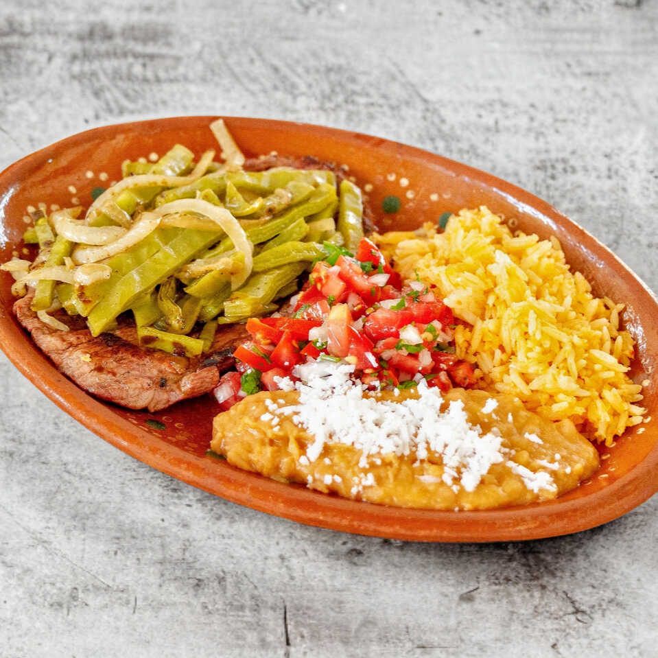 Corte de arrachera con nopales guisados arroz frijoles y piquito de gallo