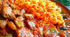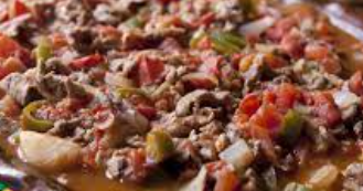Bistec guisado con jitomate cebolla y chile verde incluye arroz frijoles.