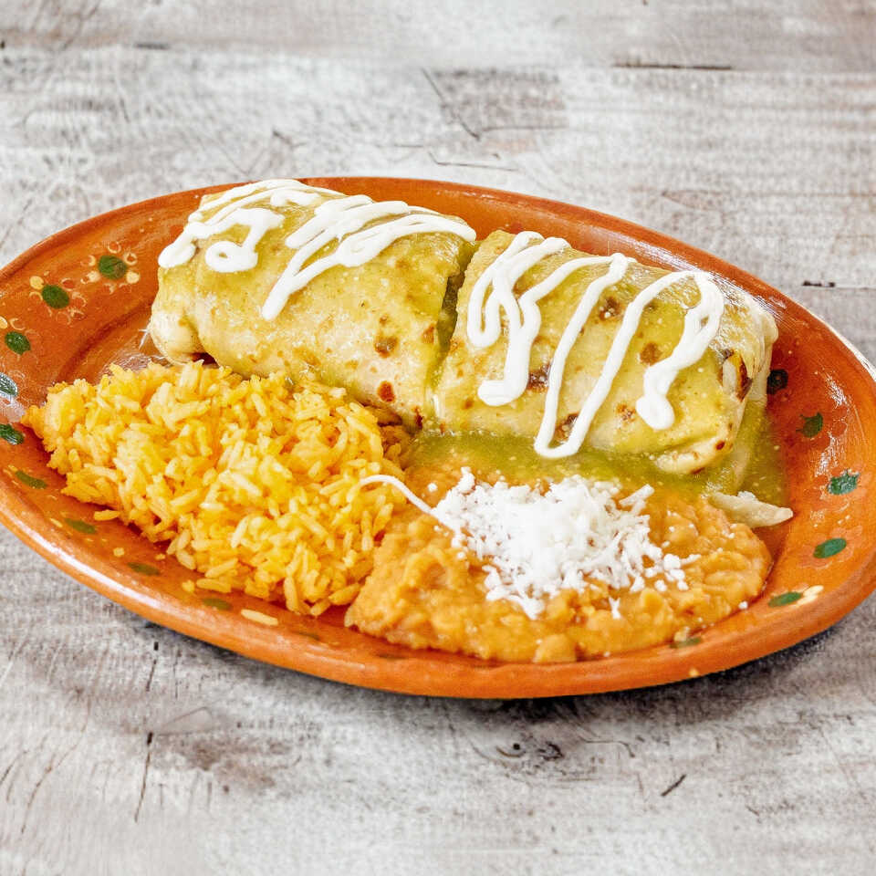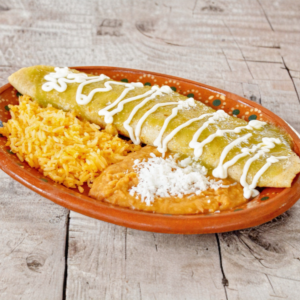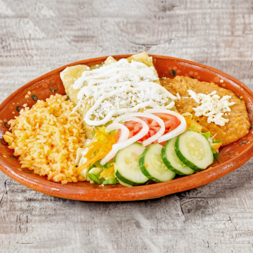 3 Enchiladas verdes o rojas acompañada de arroz frito y ensaladas.
