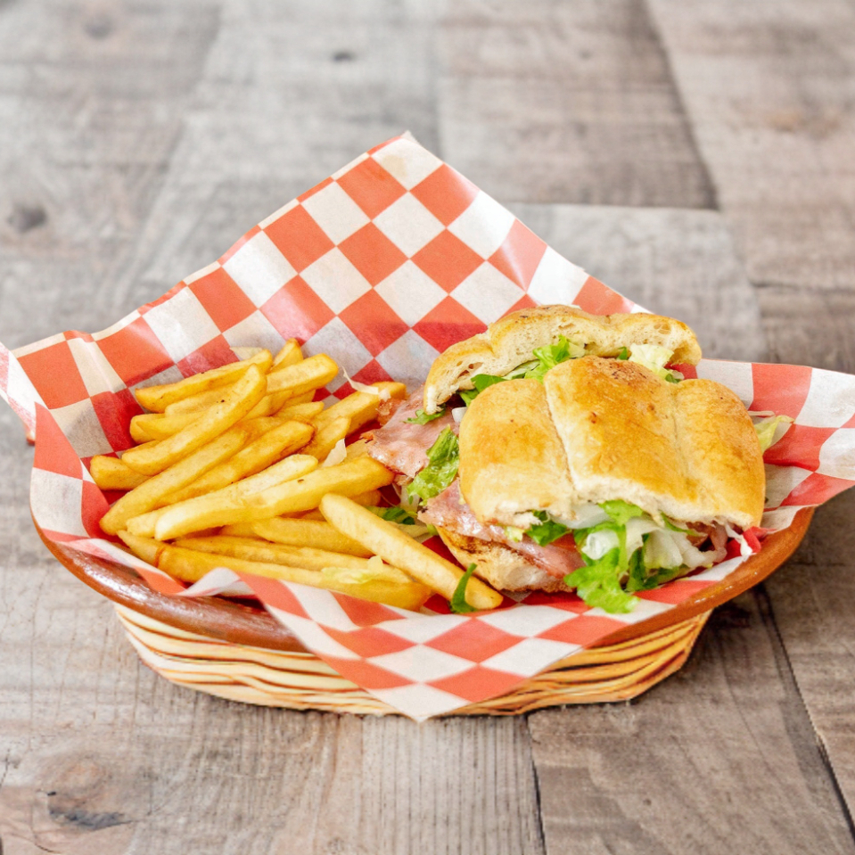 Jamón trocitos de piña y tocino con lechuga cebolla jitomate y aguacate incluye papás a la francesa