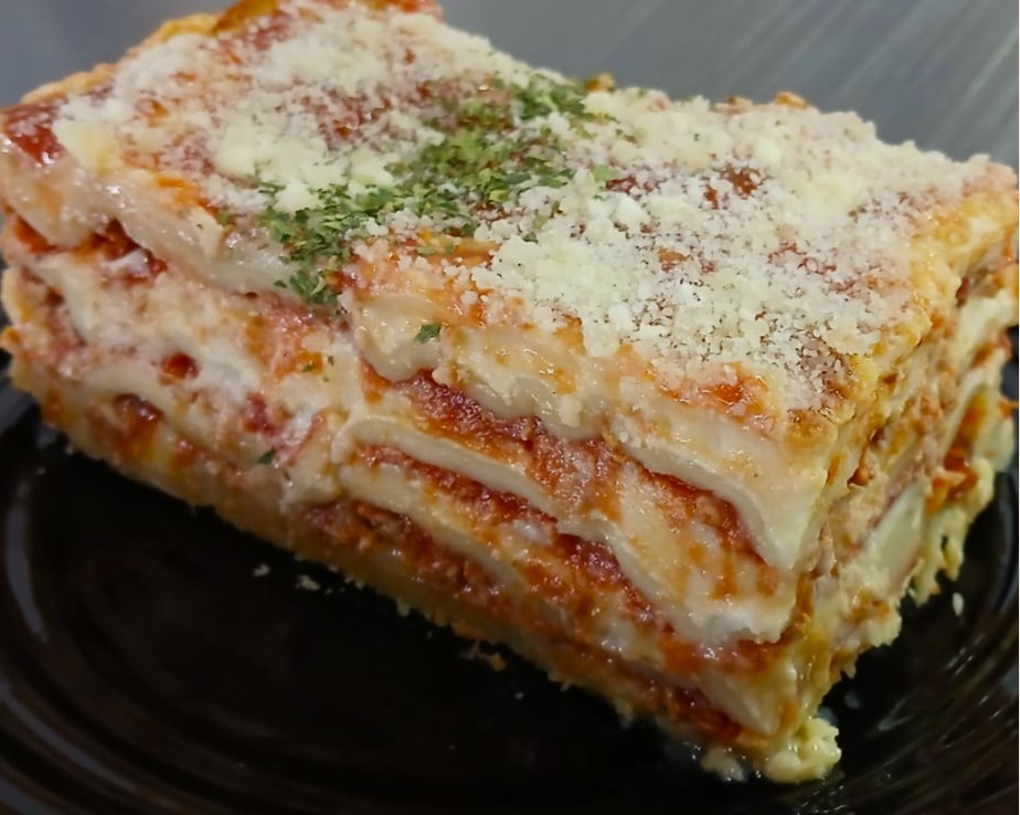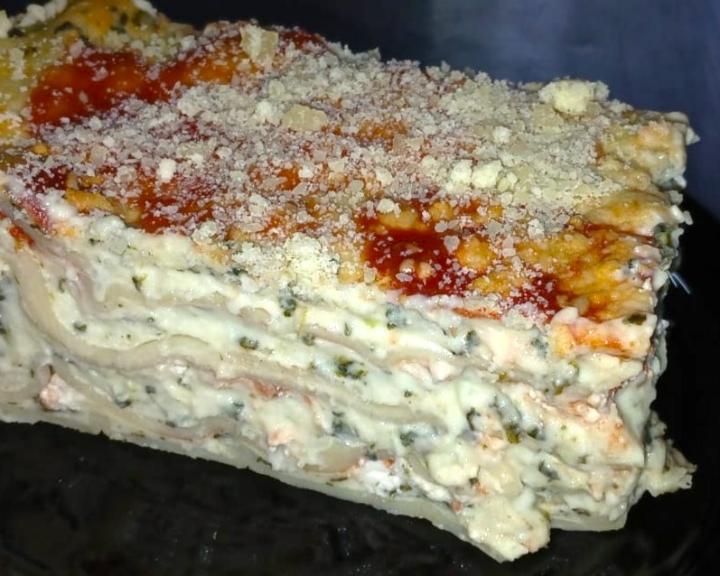 Lasaña italiana con masa casera al huevo, cocinada lentamente al horno, rellena de queso Ricotta italiana y espinacas salteadas.