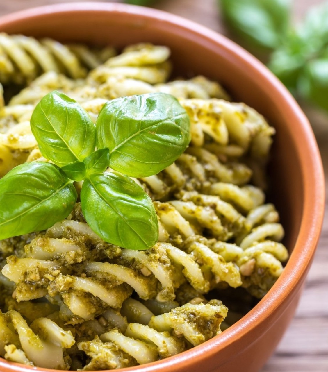 Pasta Fusilli al huevo hecha en casa con Pesto de albahaca italiano casero y un toque de tomate. Contiene nueces.