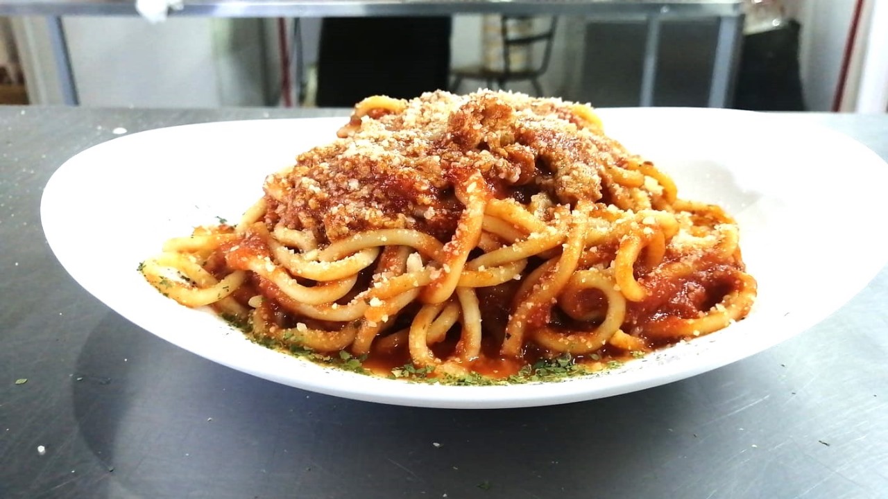 Pasta Espaguetones al huevo hecha a mano en salsa con Carne molida, Pepperoni, Chorizo y salsa de tomate.