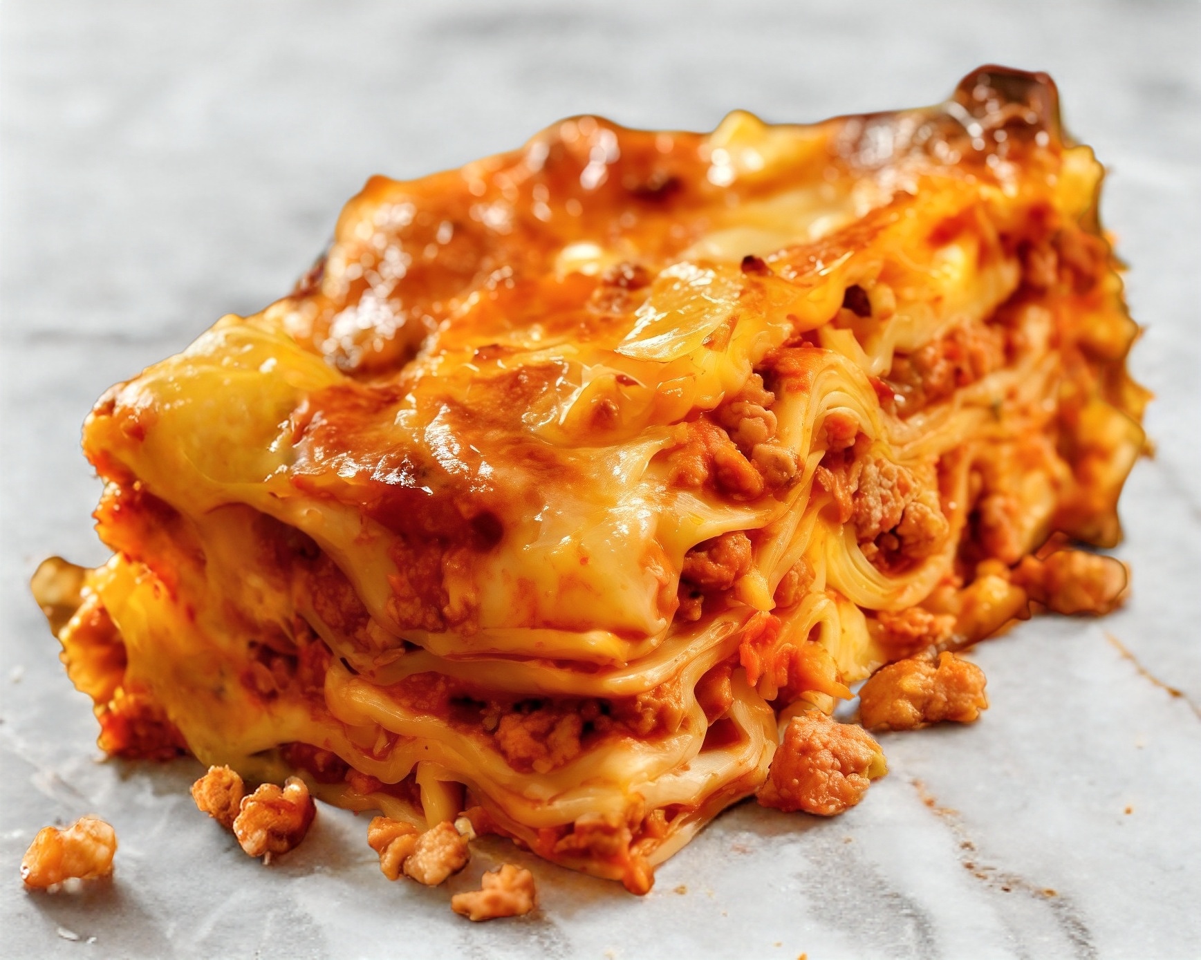 Lasaña italiana con masa casera al huevo, cocinada lentamente al horno, rellena de la clásica Boloñesa casera italiana tradicional