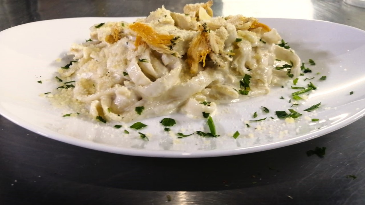 Pasta Fusilli al huevo hecha en casa con salsa de crema, quesos gouda, manchego, queso azul Gorgonzola y parmesano.