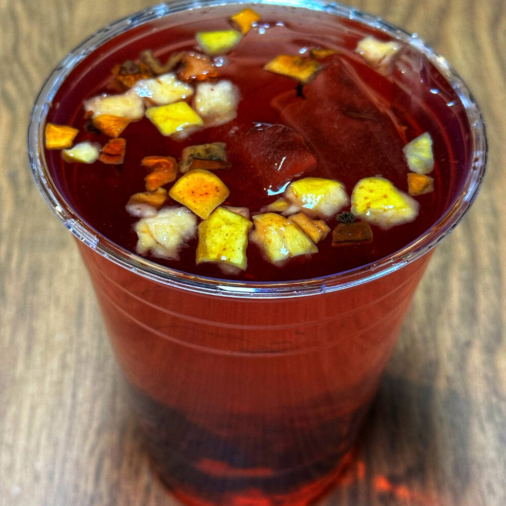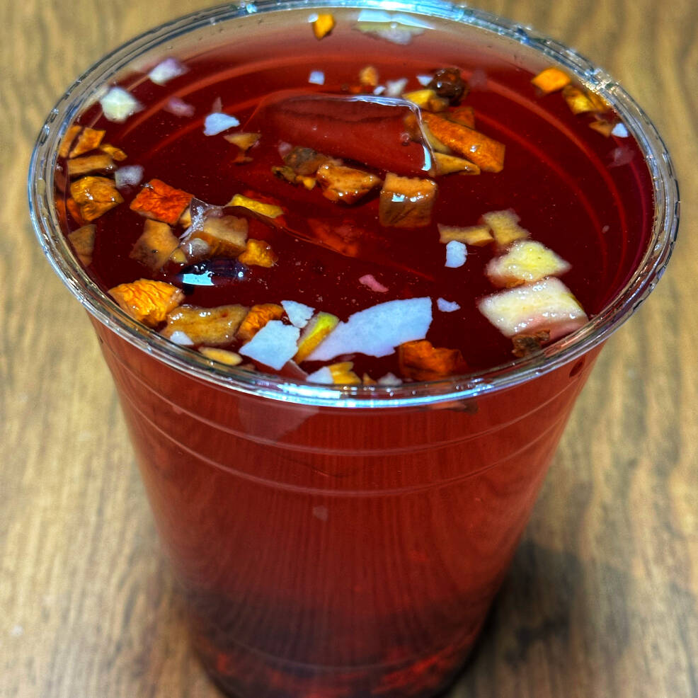 MANZANA, TROZOS DE PIÑA, CÁSCARA DE ROSA DE MOSQUETA, COCO RALLADO Y JAMAICA