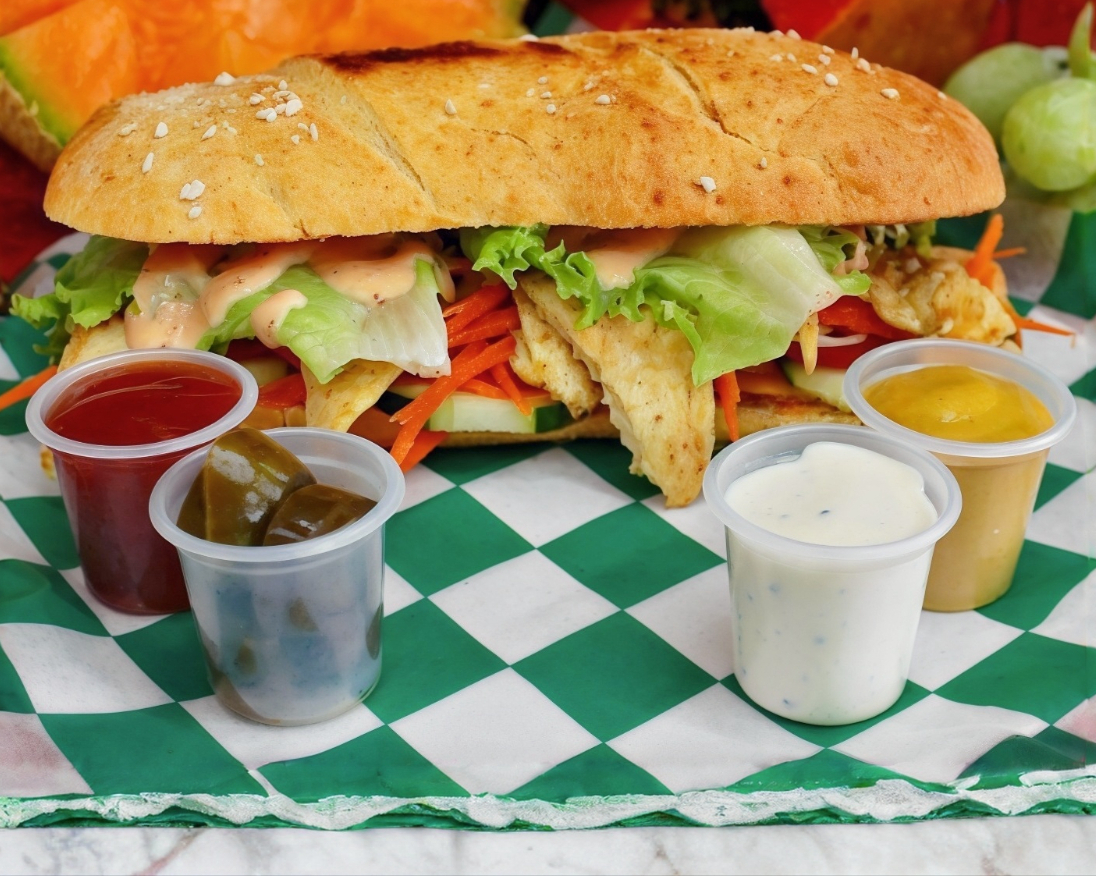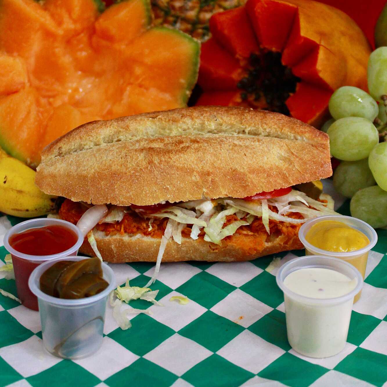 Pan de Baguette, Filete de Pollo, Queso Americano, Lechuga Italiana, Pepino, Jitomate, Zanahoria Rallada, Cebolla y Jalapeño.