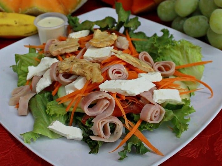 Lechuga Italiana, pollo, jamón, panela, pepino, zanahoria rallada, jitomate, cebolla y aderezo.