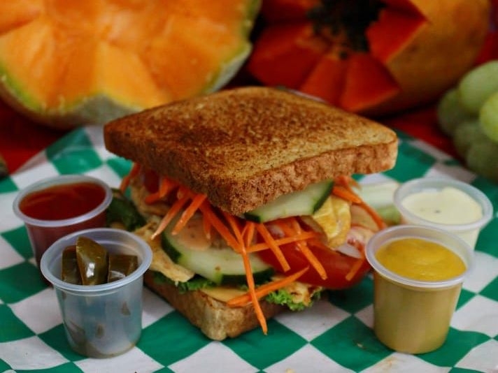 Pan integral, queso americano, lechuga italiana, pepino, jitomate, zanahoria rallada, cebolla y jalapeño.