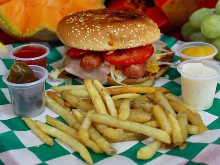Pan parrillero, carne casera de res, jamón, salchicha, queso americano, lechuga, jitomate, cebolla, jalapeño y papas.