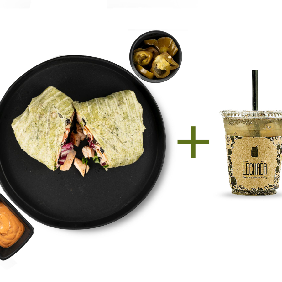 Wrap de espinaca con lechuga fresca, pepino en cubos, jitomate, zanahoria rallada crujiente,100 g de tu proteína favorita y un toque de tu aderezo casero preferido mezclado dentro, lo acompañamos con jalapeños y chipotle al lado+ agua de limón con chía.