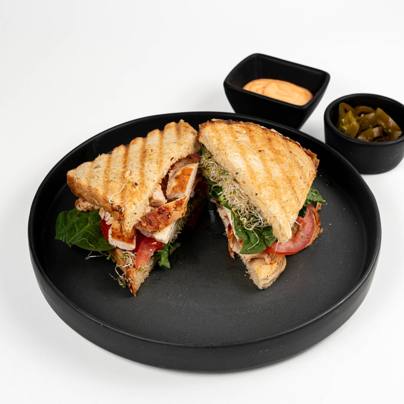 Pan artesanal de 10 granos, relleno con tu proteína favorita 85g, queso panela 30g, espinaca fresca, germinado, pepino, jitomate, zanahoria rallada crujiente y un toque de tu aderezo casero preferido dentro y lo acompañamos con jalapeños y chipotle al lado.