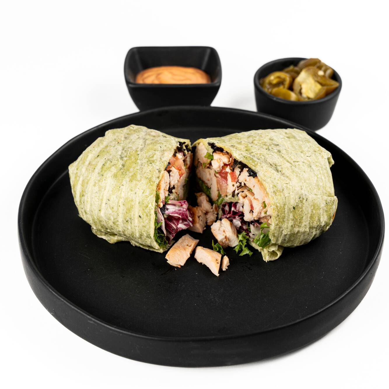 Tortilla de espinaca rellena con lechuga fresca, pepino en cubos, jitomate jugoso y zanahoria rallada crujiente. Incluye 100 g de tu proteína favorita y un toque de tu aderezo casero preferido mezclado en su interior. Para darle un extra de sabor, lo acompañamos con jalapeños y chipotle al lado.