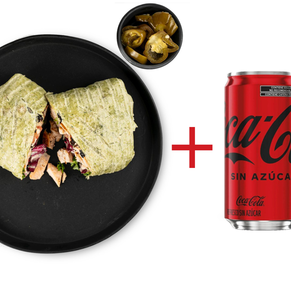 Wrap de espinaca con lechuga fresca, pepino en cubos, jitomate, zanahoria rallada crujiente,100 g de tu proteína favorita y un toque de tu aderezo casero preferido mezclado dentro, lo acompañamos con jalapeños y chipotle al lado+ coca sin azucar.