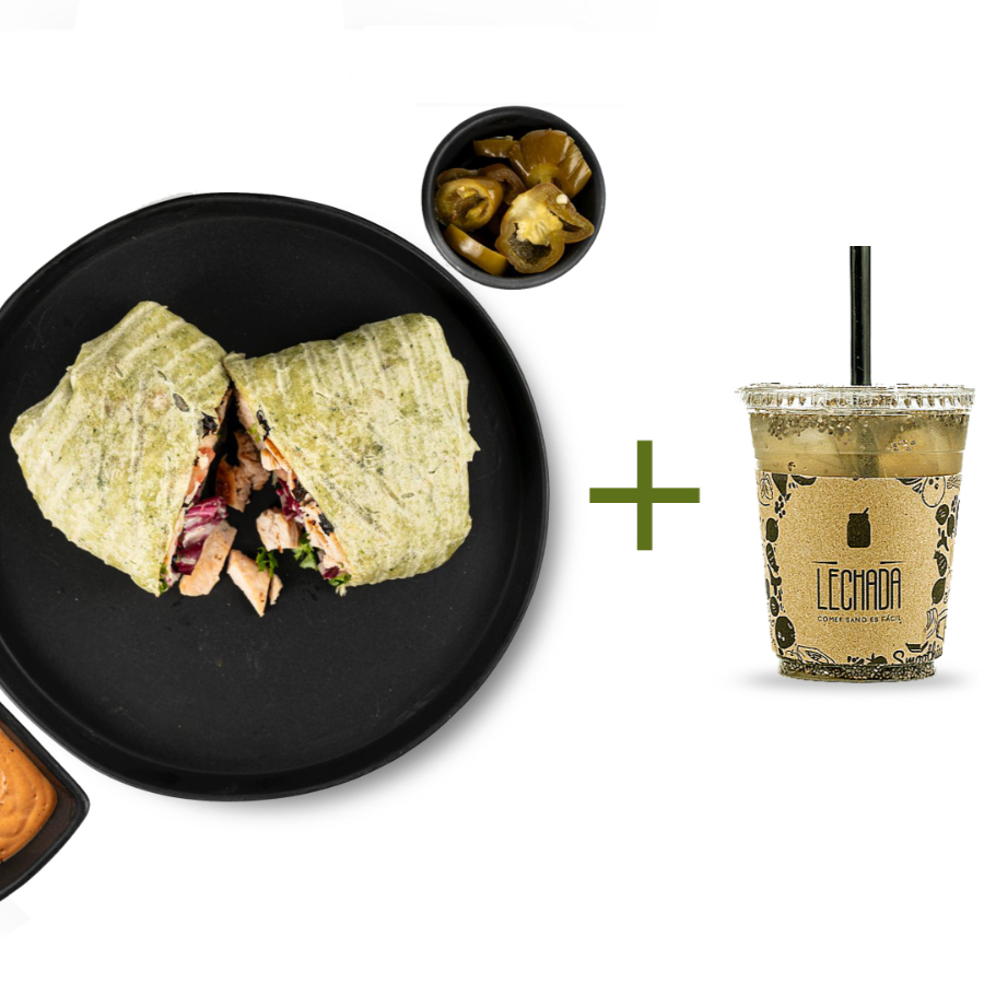 Wrap de espinaca con lechuga fresca, pepino en cubos, jitomate, zanahoria rallada crujiente,100 g de tu proteína favorita y un toque de tu aderezo casero preferido mezclado dentro, lo acompañamos con jalapeños y chipotle al lado+ agua de limón con chía.
