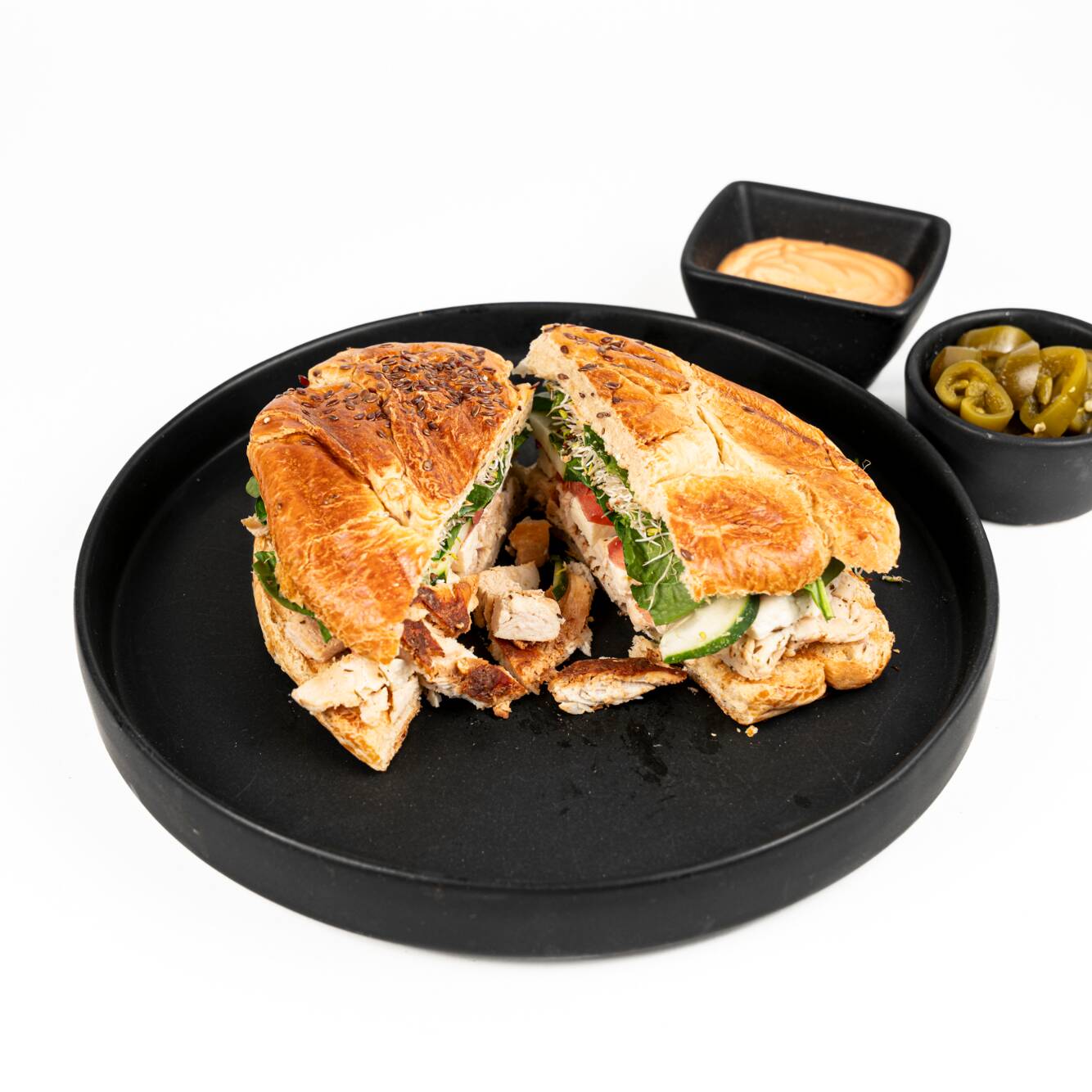 Crossaint artesanal de 10 granos relleno con tu proteína favorita 85g, queso panela 30g, espinaca fresca, germinado, pepino, jitomate, zanahoria rallada crujiente y un toque de tu aderezo casero preferido dentro y lo acompañamos con jalapeños y chipotle al lado.