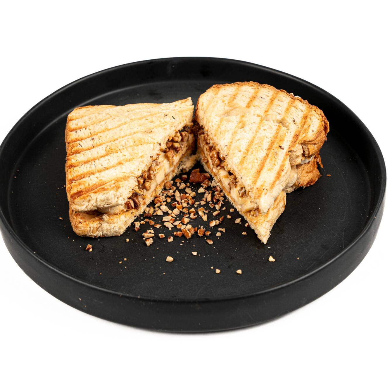 Sandwich de Pan artesanal de 10 granos relleno con crema de cacahuate 100 natural, rodajas de plátano fresco y nuez troceada.