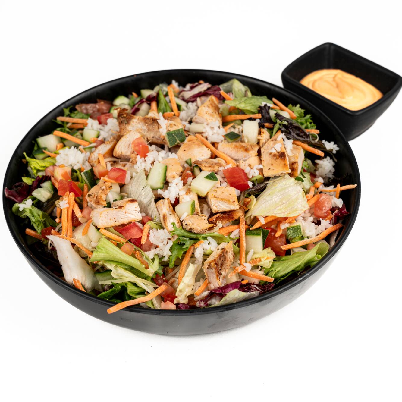 Mezcla de lechuga fresca, 130g de pollo a la plancha, zanahoria rallada fresca, jitomate, pepino crujiente, aderezo cesar chipotle y arroz al vapor natural.