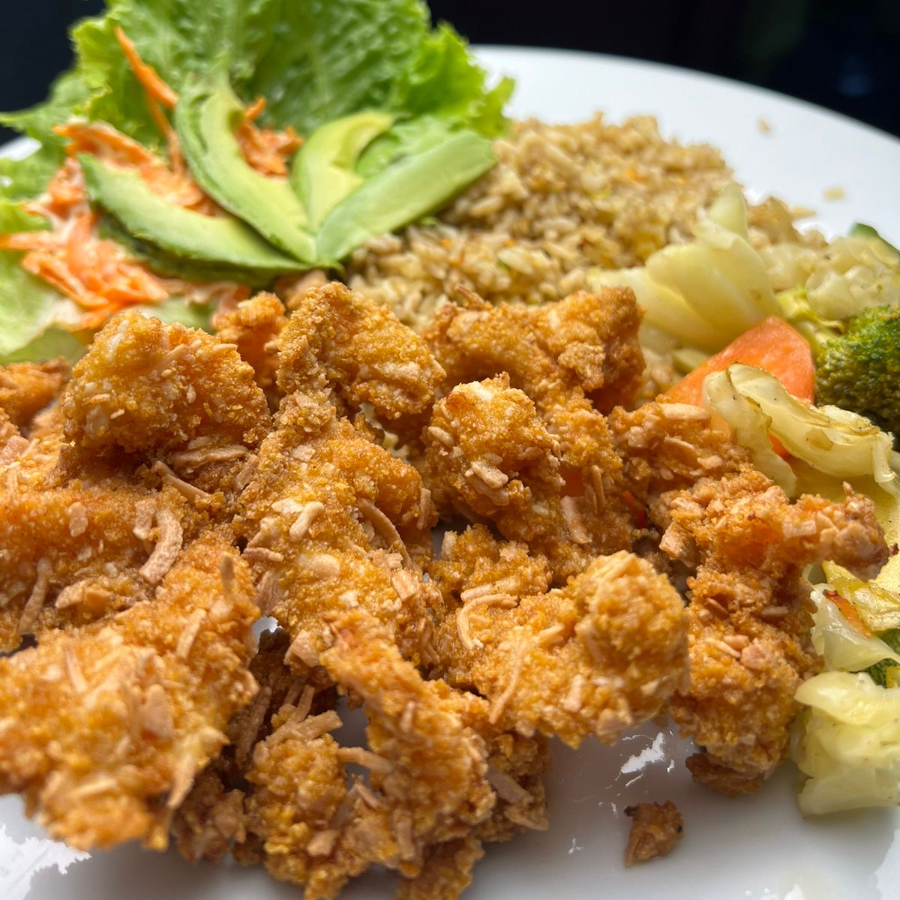 Arroz frito, ensalada y camarones empanizados.