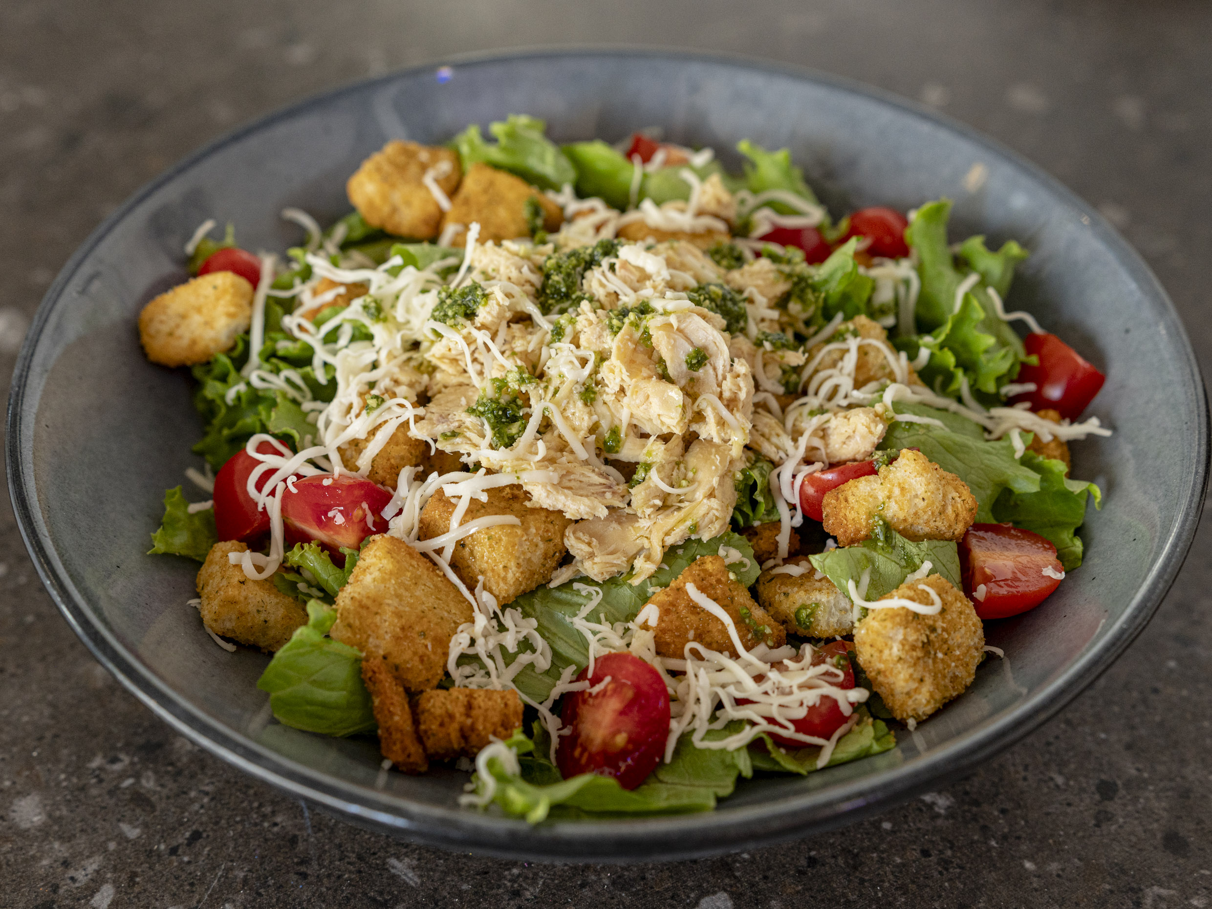Rica ensalada con pollo pesto, frutos rojos.