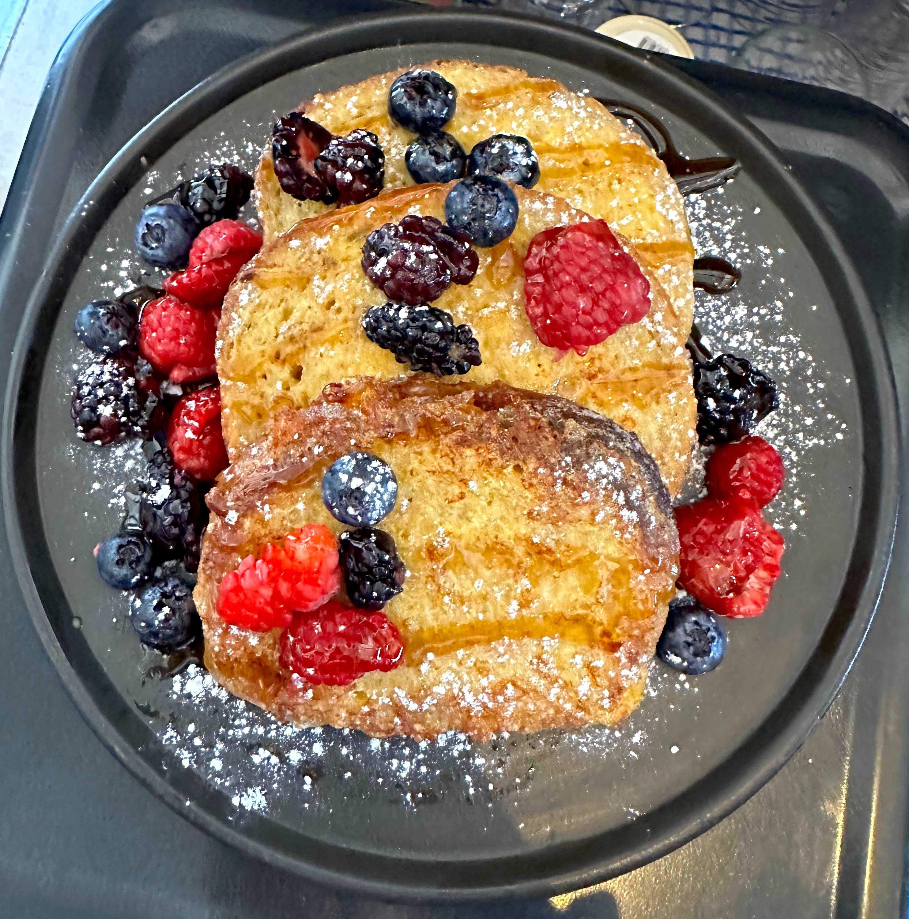 Delicioso pan francés acompañado de frutos rojos frescos.