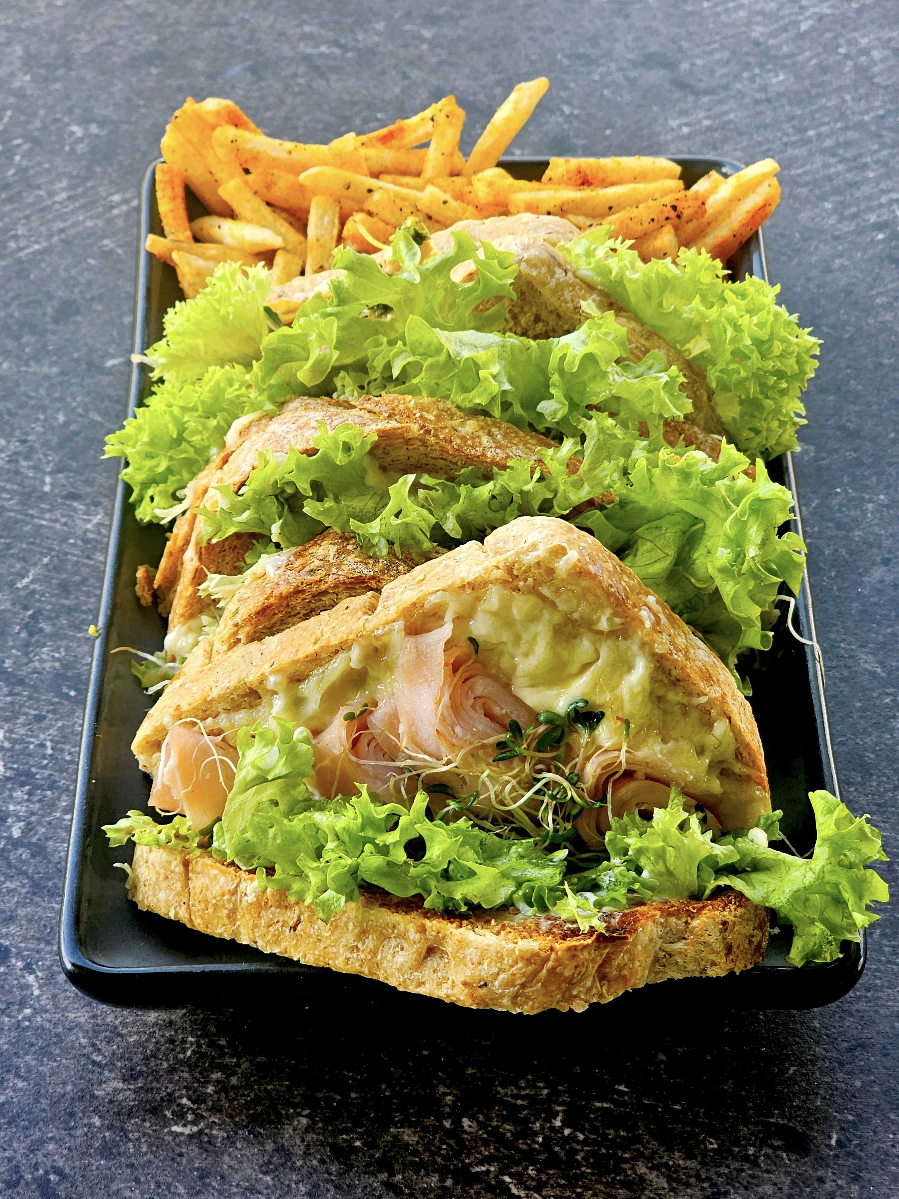 Rico sándwich de jamón acompañado de ensalada o papas.