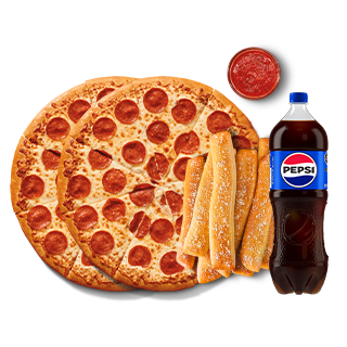 2 pizzas de pepperoni y/o queso + 1 Crazy Bread + 1 Crazy Sauce + 1 refresco de 2 litros