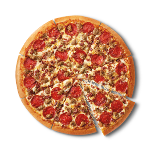 Pizza grande con 3 secciones diferentes: 4 rebanadas de pepperoni, 2 rebanadas de jamón con salchicha italiana y 2 rebanadas de extra queso.