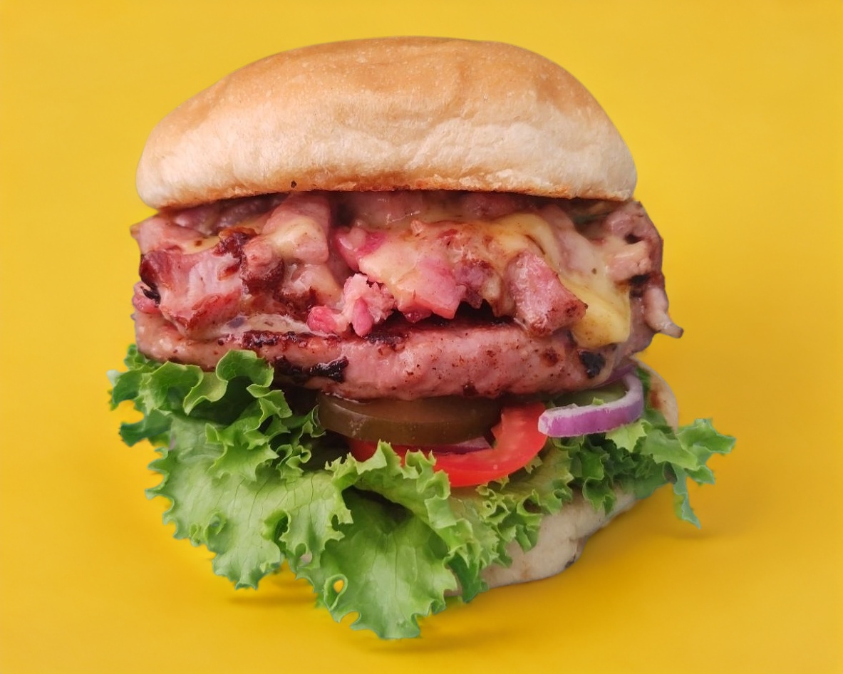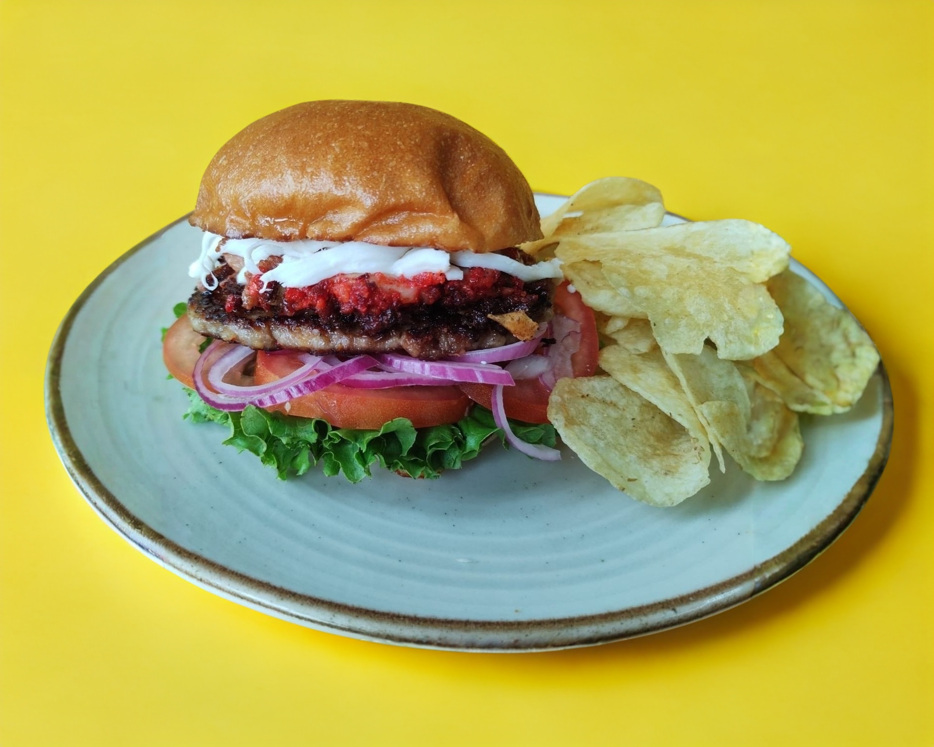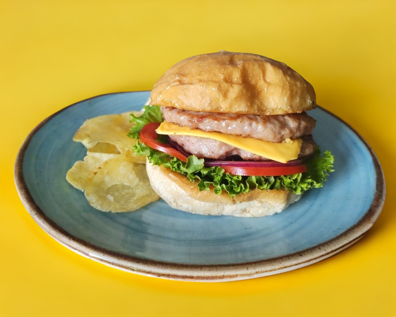 Bollo brioche, carne de res ,chorizo con queso oaxaca, lechuga ,jitomate, cebolla morada acompañada de papas doradas.