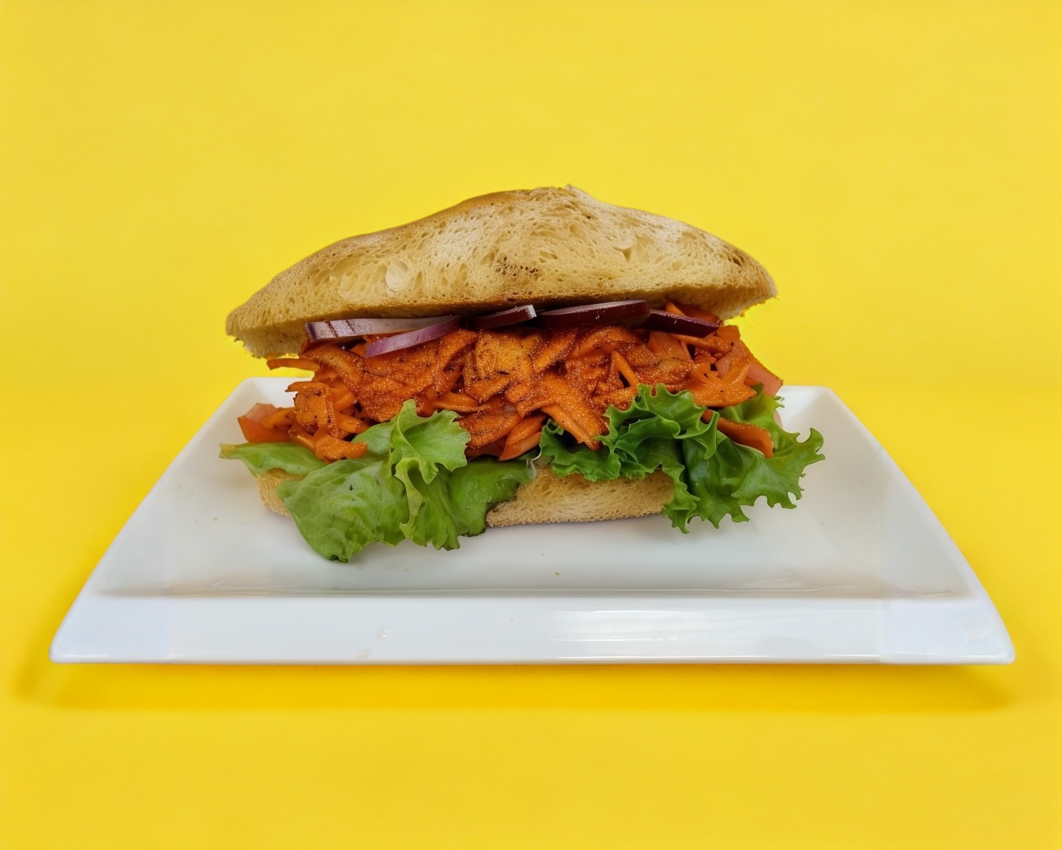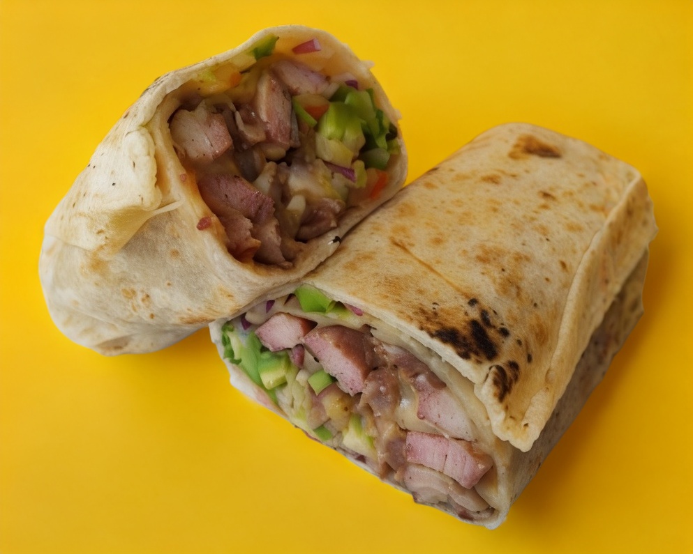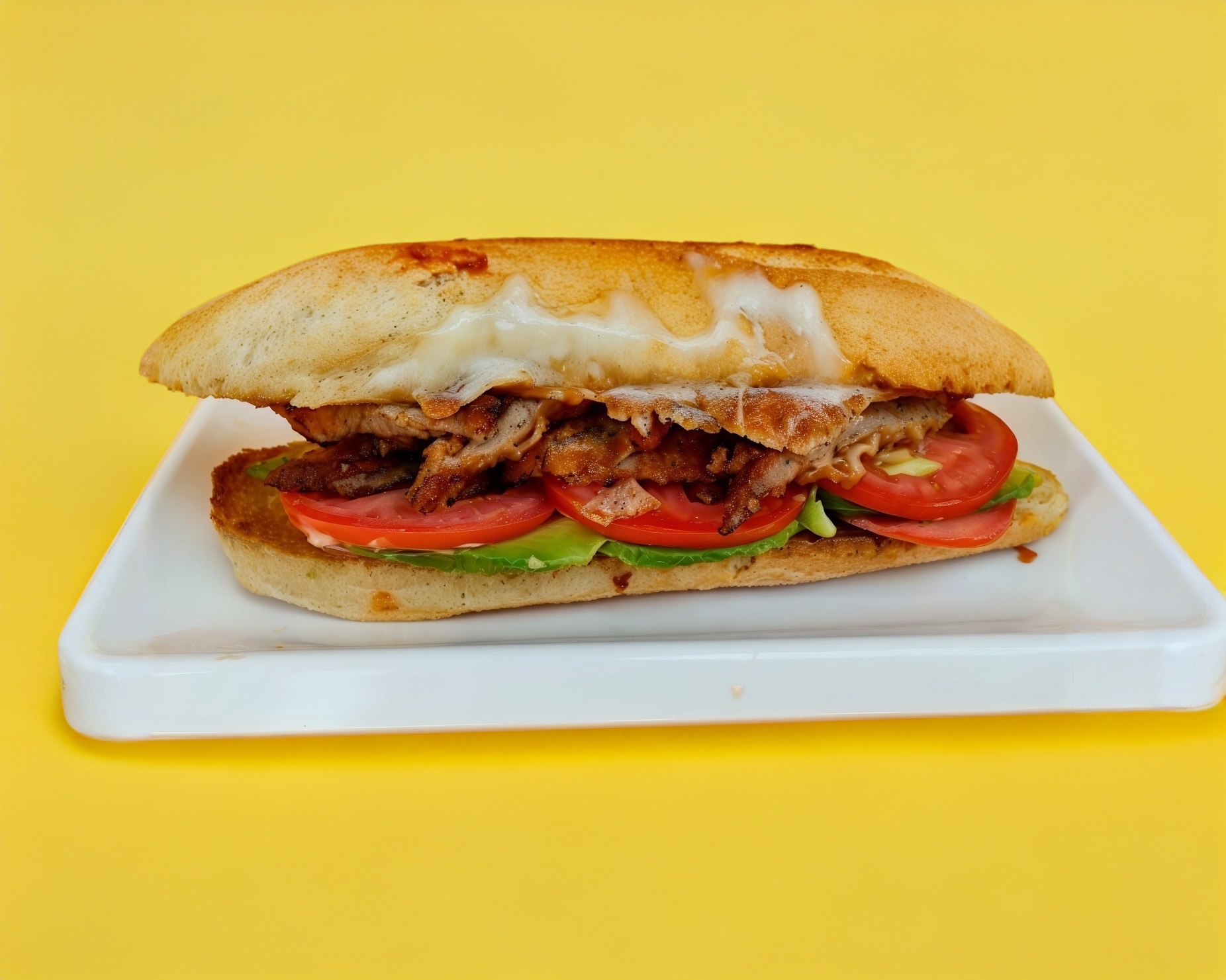 Bollo brioche, carne de res ,chorizo con queso oaxaca, lechuga ,jitomate, cebolla morada acompañada de papas doradas.