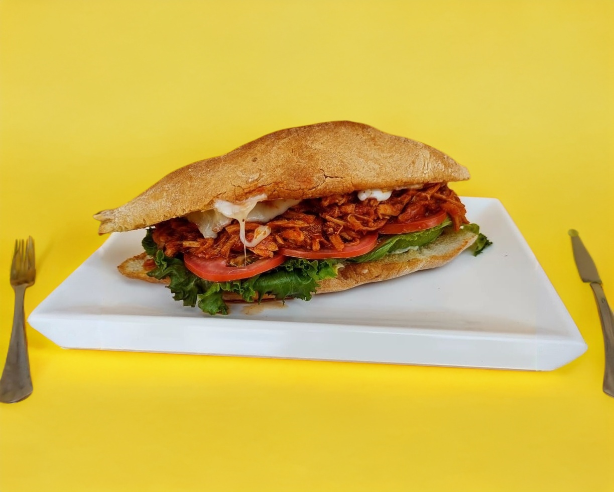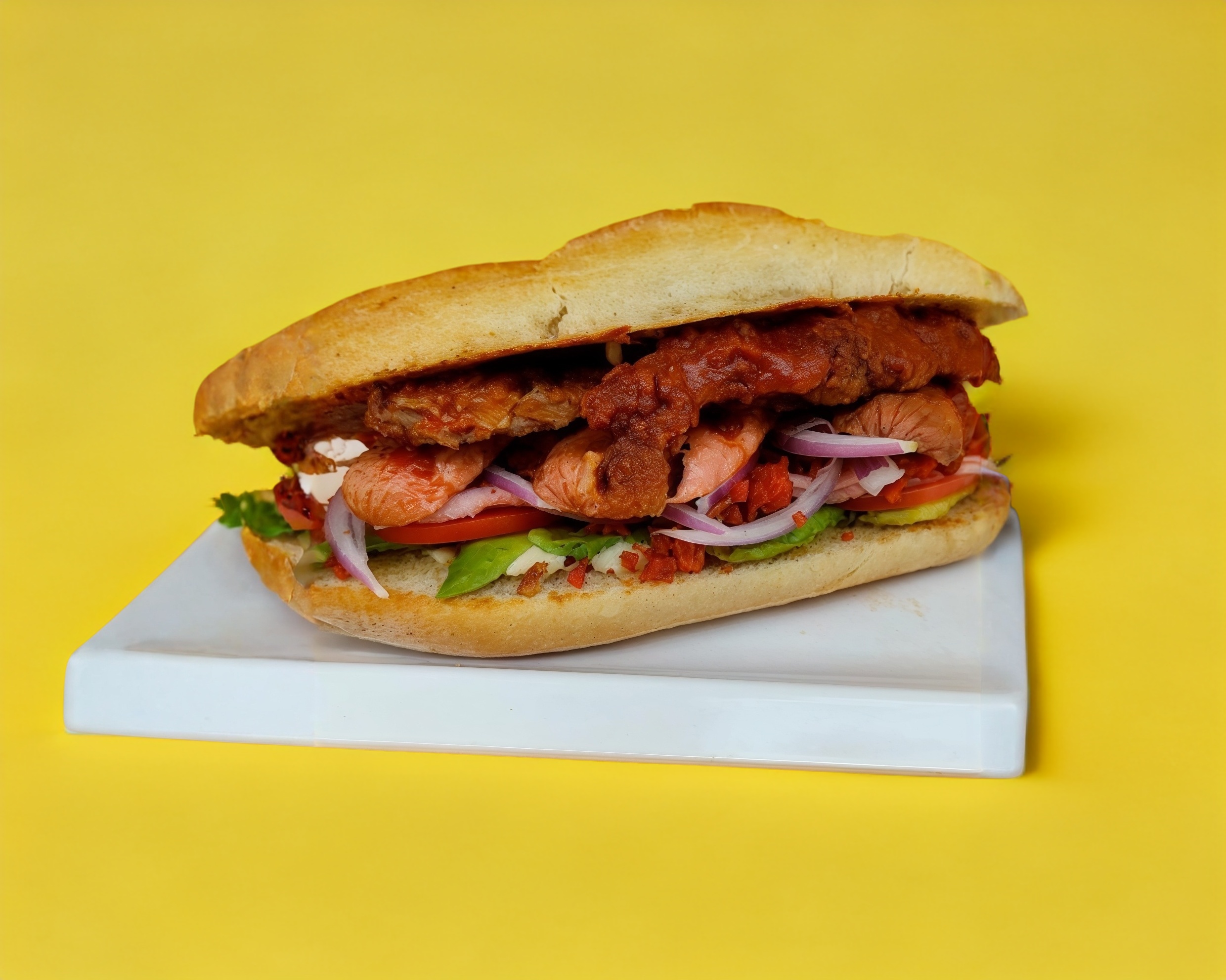Milanesa de pollo acompañada de lechuga, jitomate, cebolla morada, costra de queso oaxaca y chile chipotle.